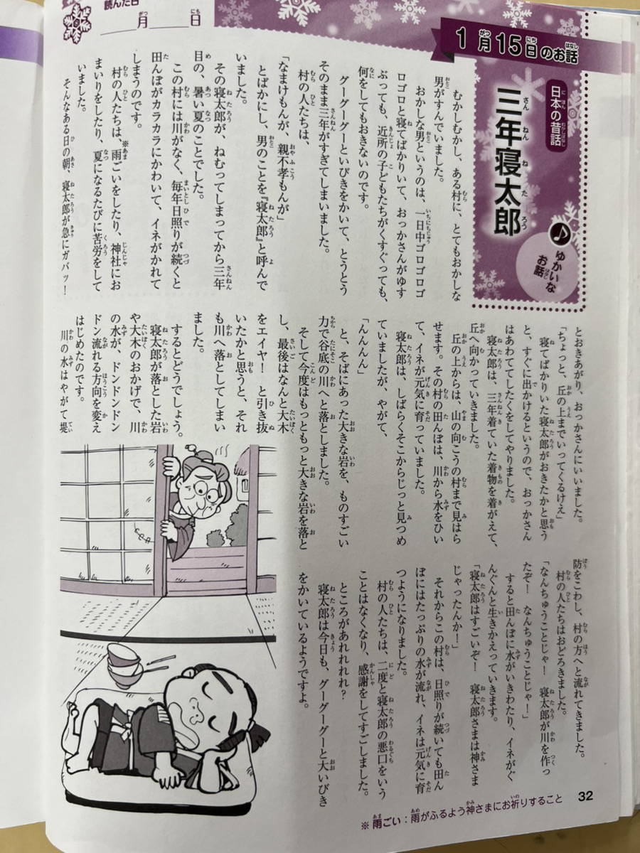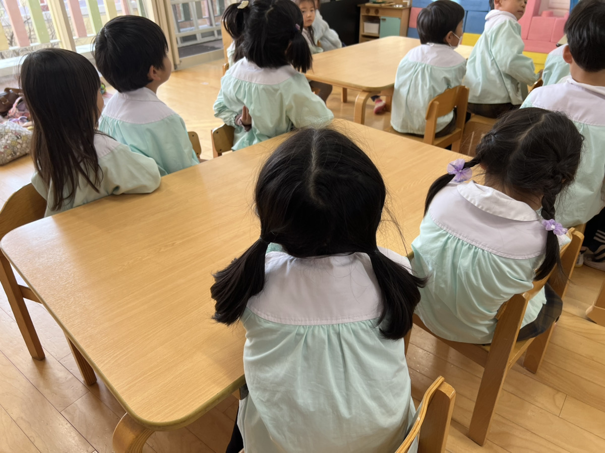 今日は、聞く活動でした。日本の昔話のなかでも、ゆかいなお話です。いびきの所を「グーグーグー」とまねをしてみたり、大木を引き抜いたところで驚いたりと、クスクス笑いながら聞き入る子どもたちでした。読み終わり、みんなに「ずっと寝ているか?起きているかどっちがいい?」と聞くと、起きている方が良いと思った子が多く、ずっと寝ている子は5名でした。