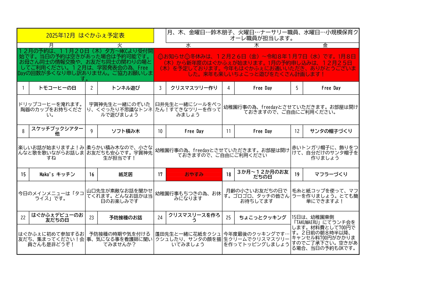 12月度の予定をアップ!『0・1歳向けの親子教室』平日毎日開催!#はぐかふぇ 12月の予定をアップしました。大切な子育ての楽しい時間にしていきましょう!新規の会員登録や不明点はお気軽にお問合わせください!よろしくお願いいたします! お問い合わせはコチラ!
